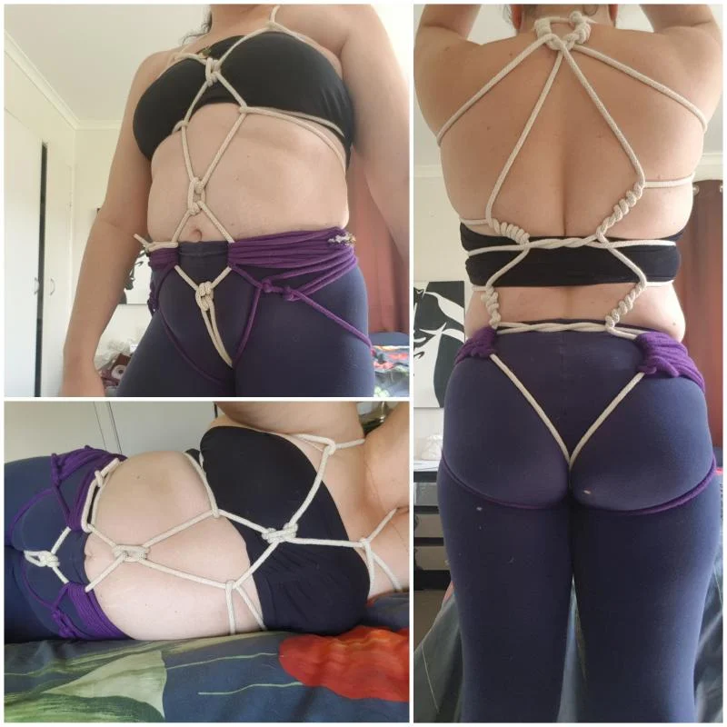 Goes without saying that body/torso ties have lots of different points to be aware of especially in the groin and neck regions. Like always start off looser than what you think and build up. Especially when having your ropes loop and cross eachother, your central rope will gradually become more taught. Any sign of pain, tingling or numbness remive ropes immediately