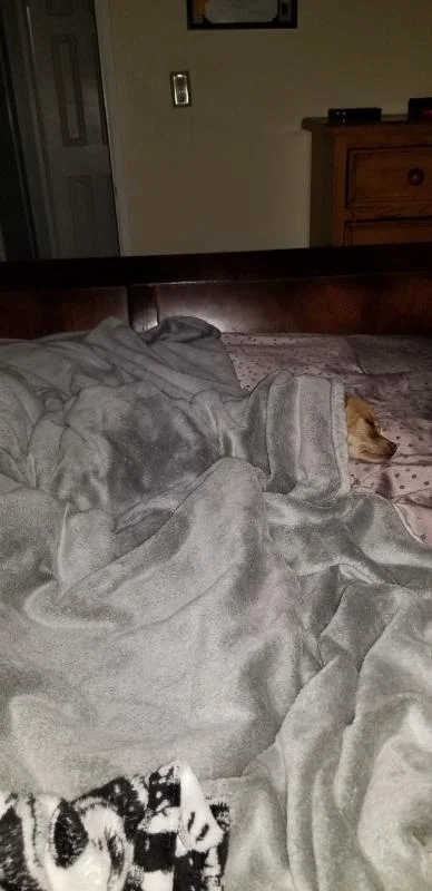 The owner of the stuffie hiding under a blanket because she cant believe what she witnessed stuffiecide.... the culprit was tired and found guilty after I gimped my way to the bathroom. The cleaning crew worked its magic and all evidence has been wiped clean.