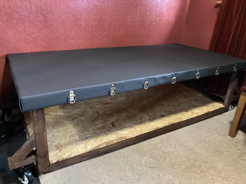 Vinyl covering on the top surface and frame done, and the D rings along each side fitted.