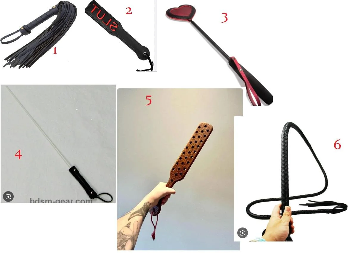 1:: Basic flogger, or cat o-nine tails: Deliciously disempowering, harsh yet playful. I love being on the receiving end of this one. Although if she's in the right mood, she can totally unload on you with this one and it WILL hurt.