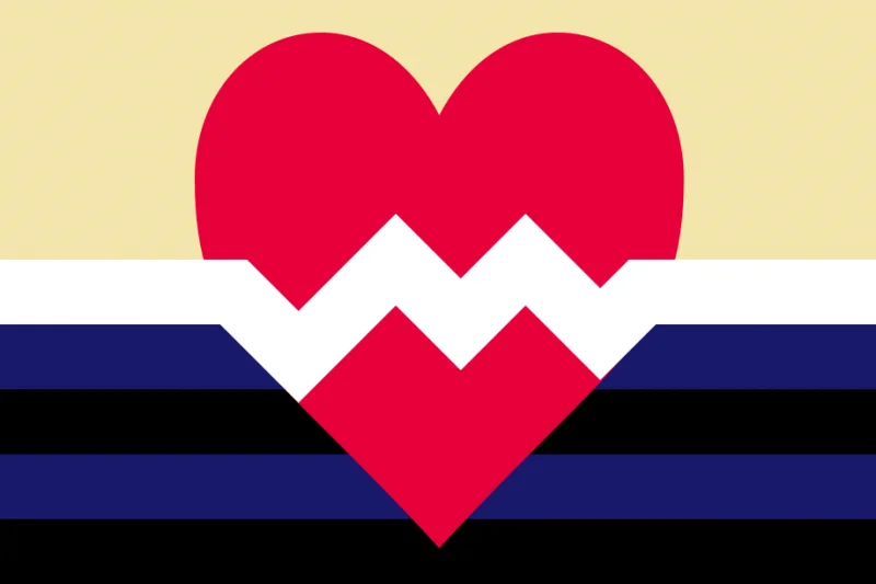 The design is built around a "broken heart" motif. The top of the flag has the rounded bumps of the top of the heart, against a field of the Pantone colour "Vanilla". A white horizontal stripe takes a jagged path through the heart, forming what looks like a more angular smaller heart below it. The jagged heart-piece is then surrounded by four black-and-blue stripes.