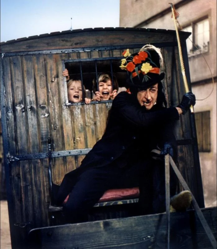 The images above are the Childcatcher from Chitty Chitty Bang Bang (I always misremembered that scene as being from Mary Poppins because the children and Dick van Dyke were in both, and kept re-watching it to find the scene), Doctor Shrinker (who seemed to want to shrink the three "shrinkees" just to keep them in cages for no reason), Mister Rogers's Neighbourhood (Bob Dog had a cage on his head as penance for something), The Smurfs (Gargamel was always pictured holding a Smurf in a cage), and that last one if you can believe it was an episode of Mork and Mindy featuring Raquel Welch as one of the alien Necrotons.