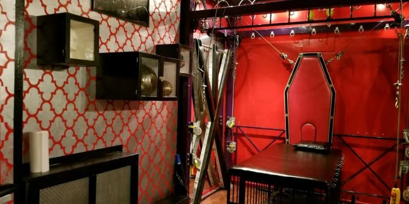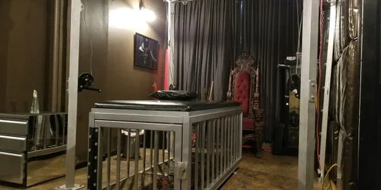 The dungeon was crowded, separated into a lobby and four “scene” rooms each equipped with various pieces of furniture including cages, spanking benches, St Andrews crosses, suspension rigs, a medical bed, a bondage chair, various beds for various purposes.