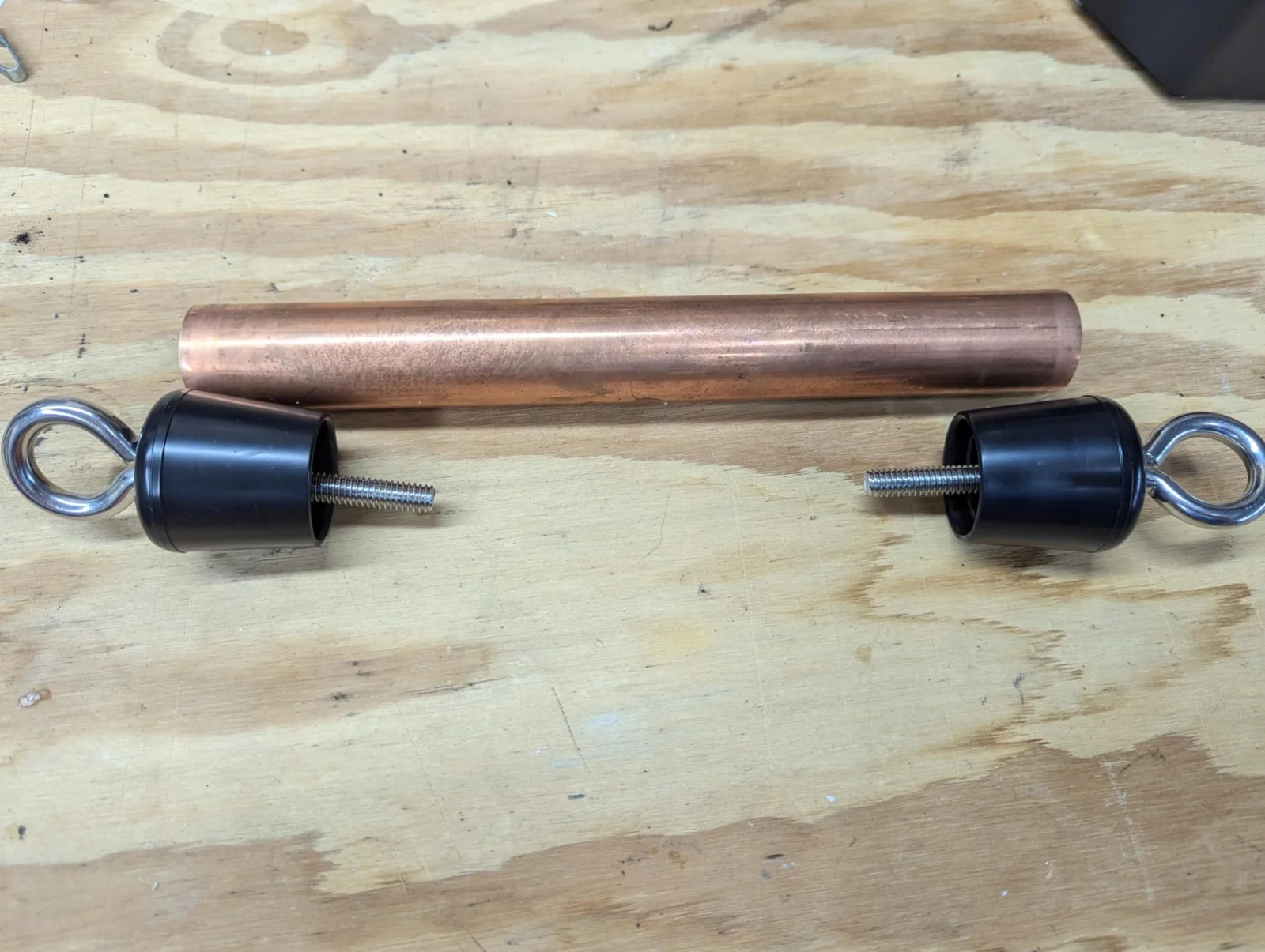 1 Inch copper tube for the body, 1 1/8th rubber leg tips, stainless steel eyebolts with a steel rubber backed washer.