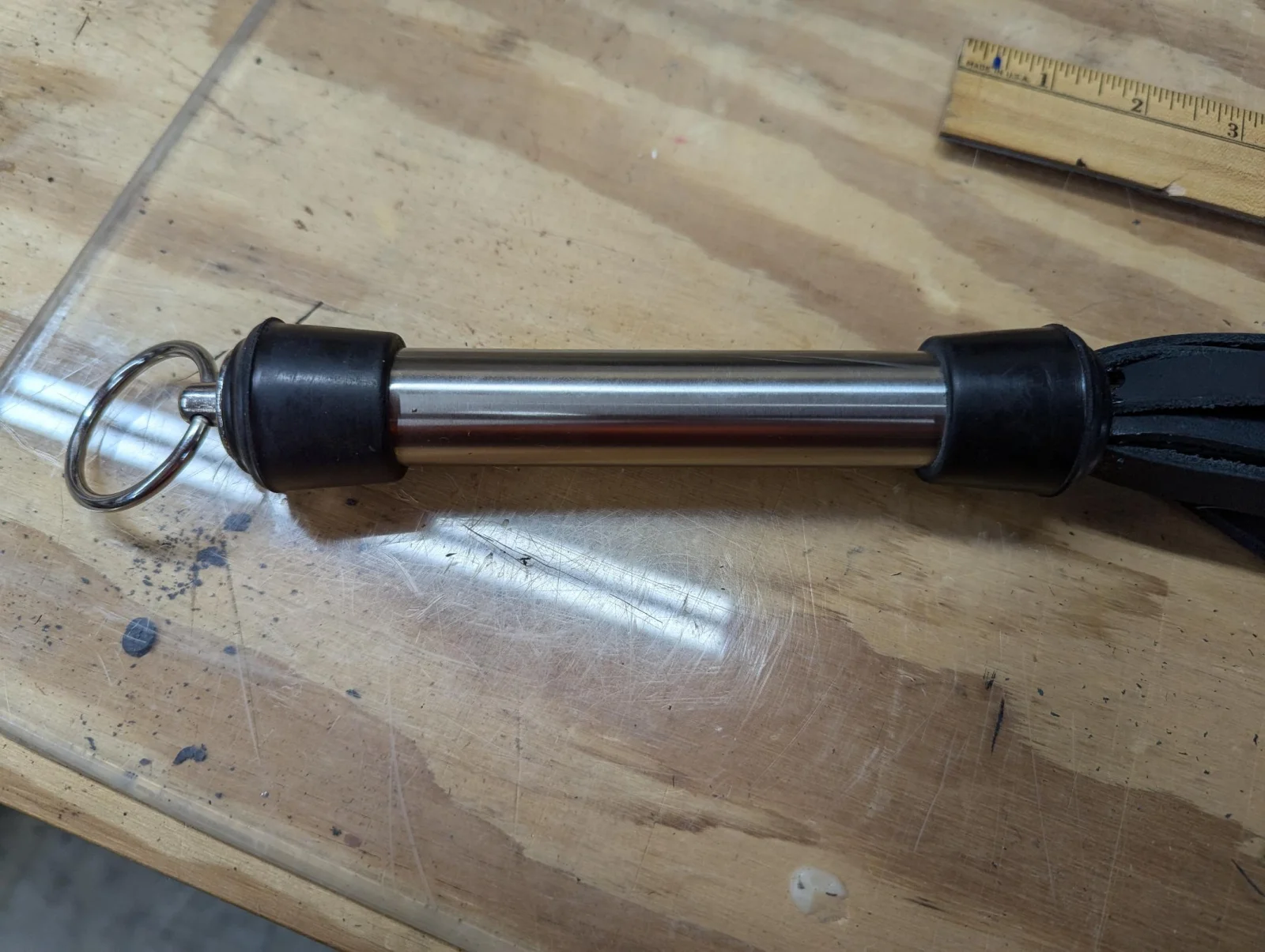 The handle is 6 inches of stainless steel tube capped on each end with a rubber cap. A chrome drawer pull on on the butt and the head cap was hollowed out to allow the falls.