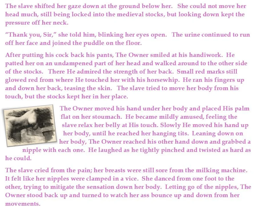 Pain from her ass caused her to arch her back. Both of her ass cheeks throbbed as she tried to move again. Jilly closed her eyes, processing the agony. When she opened them again, she found herself staring at floor between her legs. There she saw a puddle of liquid Jilly knew was her's.
