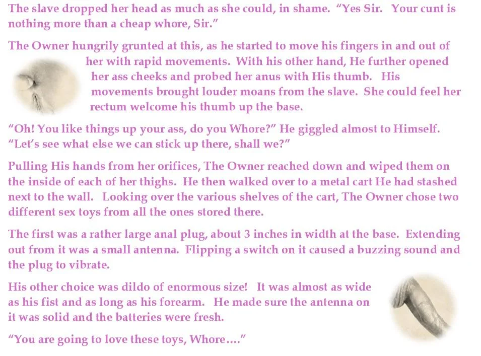 She also noticed not all the pain came from her ass cheeks. Her wrists and ankles hurt as well. Turning her gaze to each spot, Jilly found rope marks in each place. "Those are going to be some wonderful bruises" she told herself. A slight smile grew on her face.