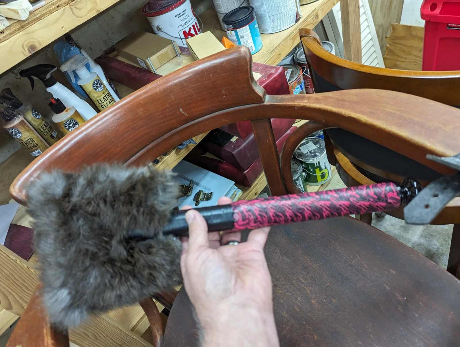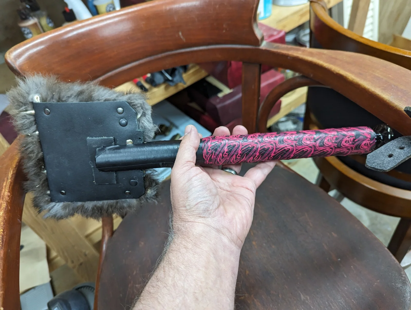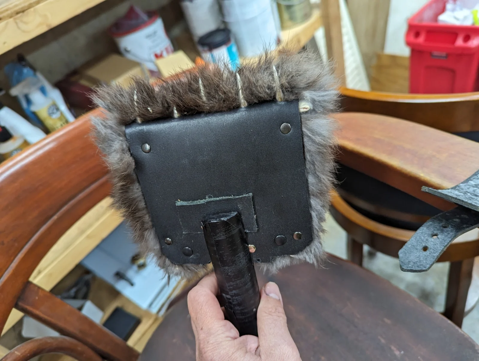 In the end, I got both wrist shackles and one leather cuff attached, but then ran out of fender washers. Guess I need another trip out to the hardware store. Here is the almost completed chair. It looks fun, doesn't it!