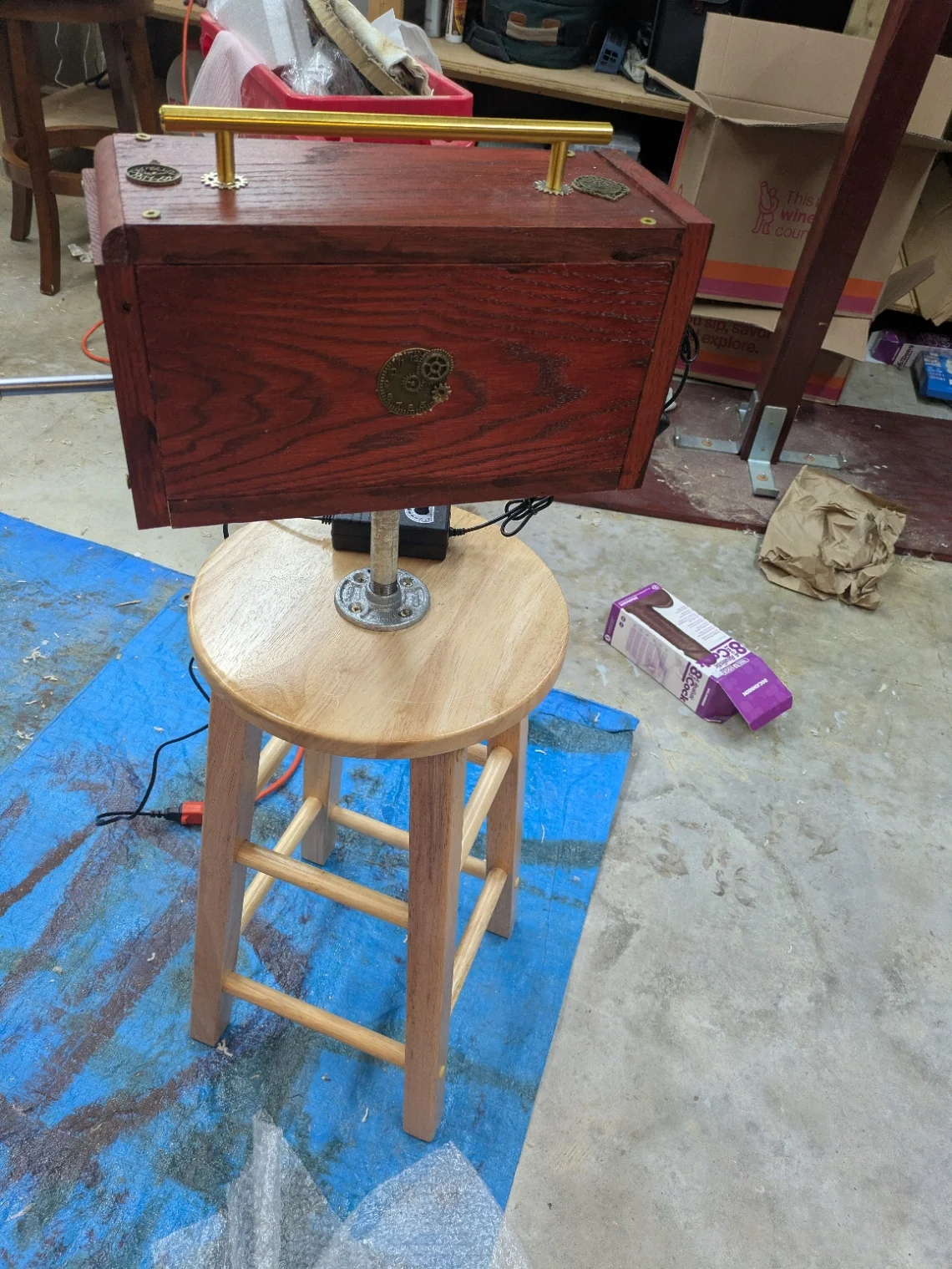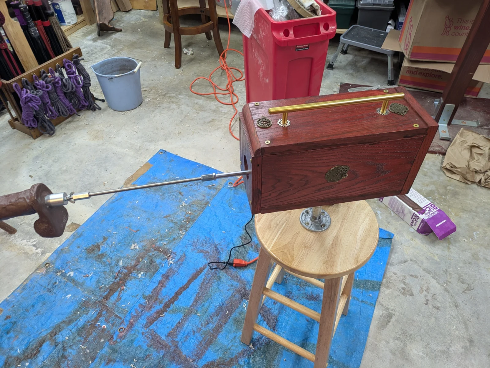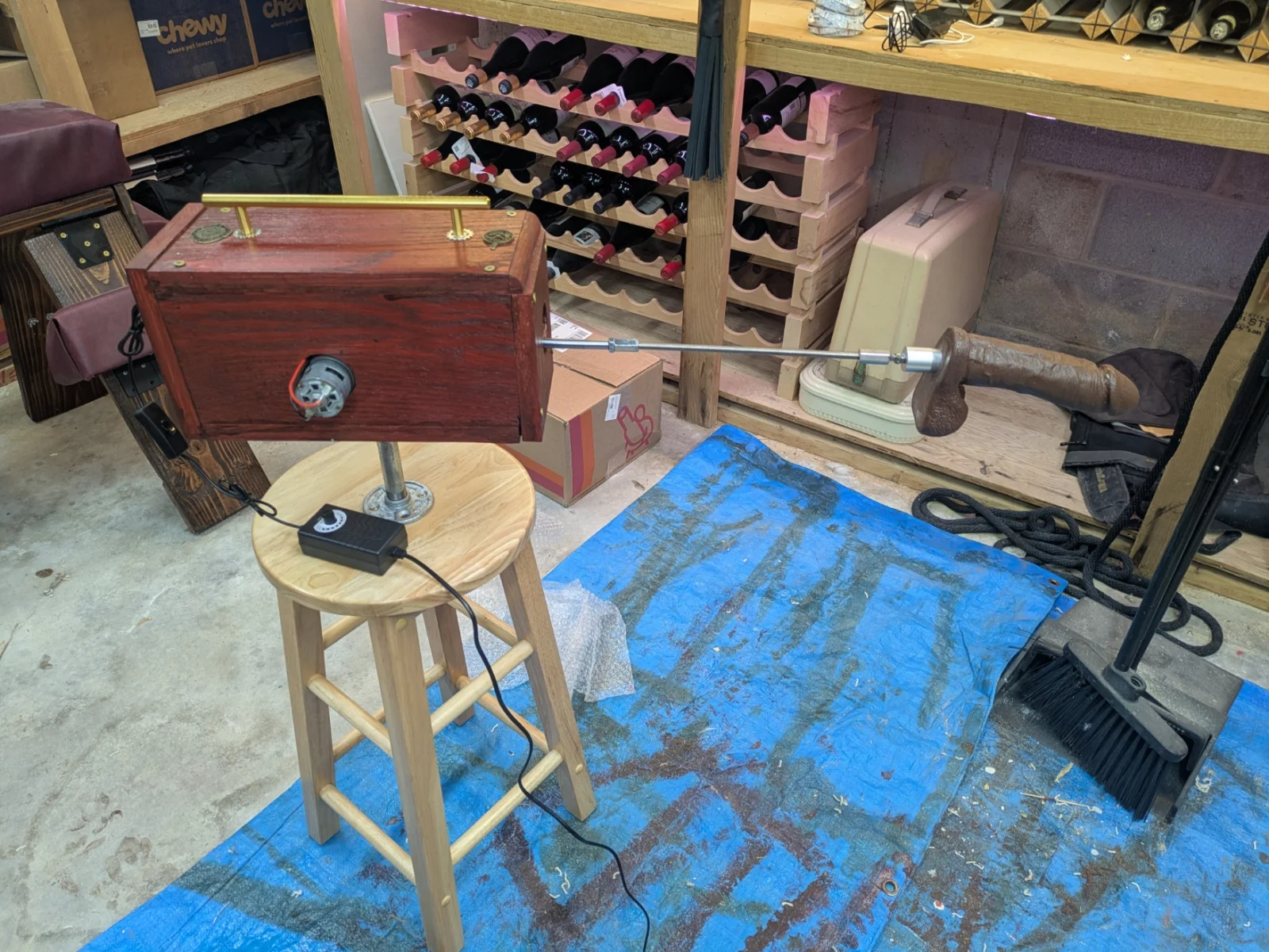 So now it is all together and works.    The stool is not stable enough to keep from rocking on high power, but a foot on the step will keep it in place while it runs.    Guess if I ever find a Testor to stick the end of it into, I will find out how really functional it is: