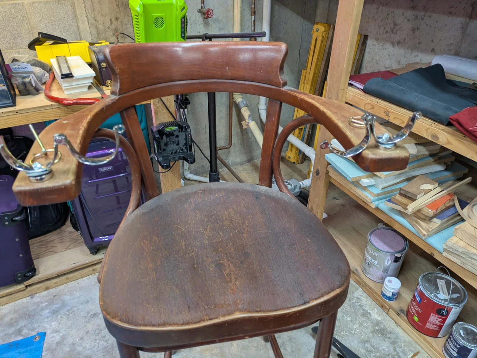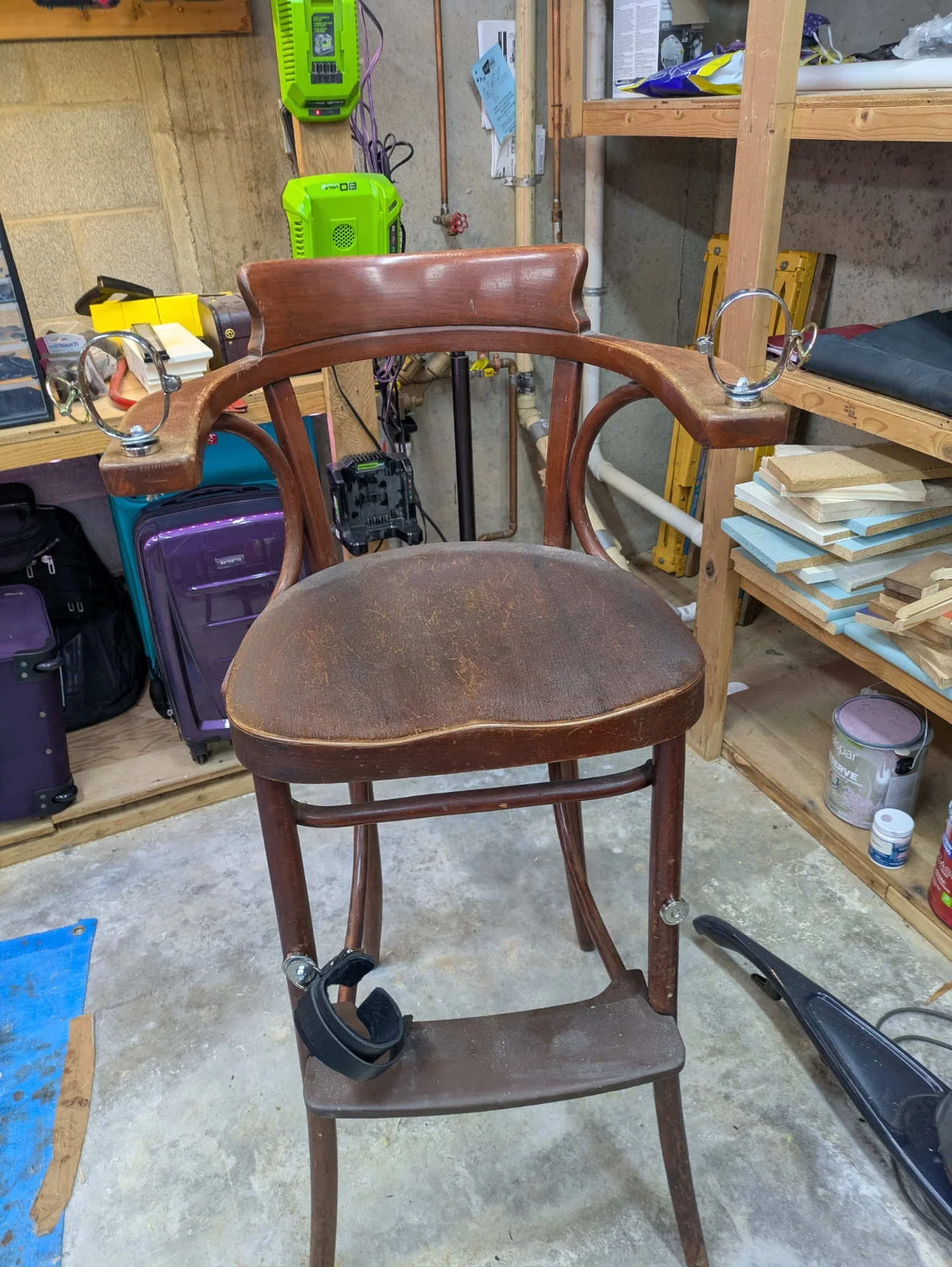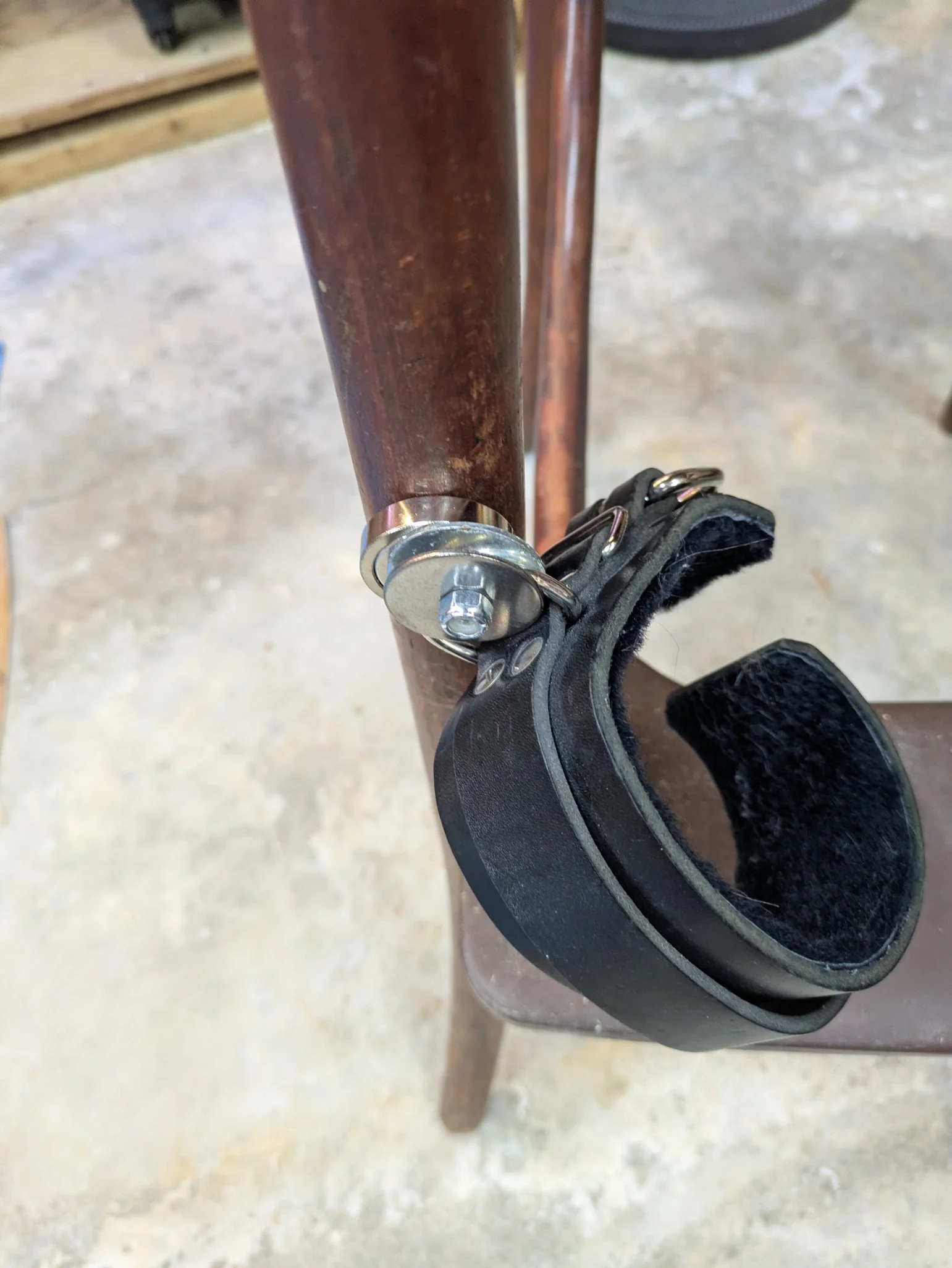 In the end, I got both wrist shackles and one leather cuff attached, but then ran out of fender washers.   Guess I need another trip out to the hardware store.     Here is the almost completed chair.     It looks fun, doesn't it!