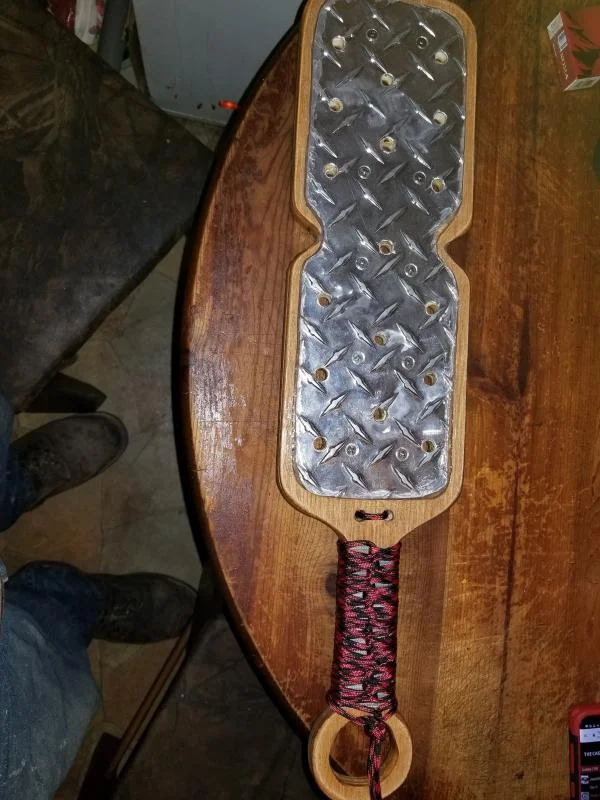 These two pics are of the same paddle i made. Alot have seen it already. Some have not. It is then front view and the back view. The first picture is the final product. I had to change out the handle wrap because i didnt feel like the colors in the second picture matched this individuals personality. Black and red is a much better fit. The treadplate is recessed into the wood and i have added a rubberized sealant around the edge just for added measure. I take no chances with somone getting cut. I would feel terrible.