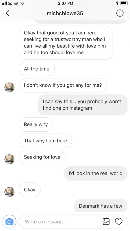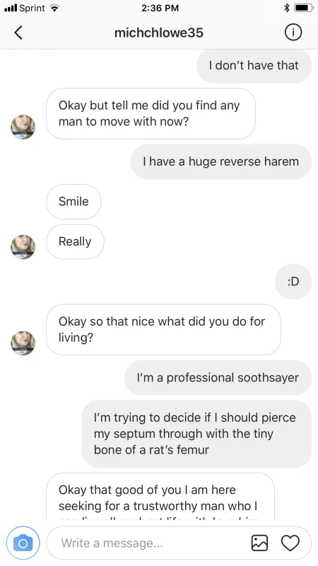 With that said... I get a lot of messages on Instagram. Anytime a complete stranger messages me with a “Hello, Dear” or “Hello, Beauty”... I know it’s time to play! And by “play”... I don’t mean role playing or kinky stuff like that. I mean... I get to make shit up. I love fantasy and writing fiction, after all.