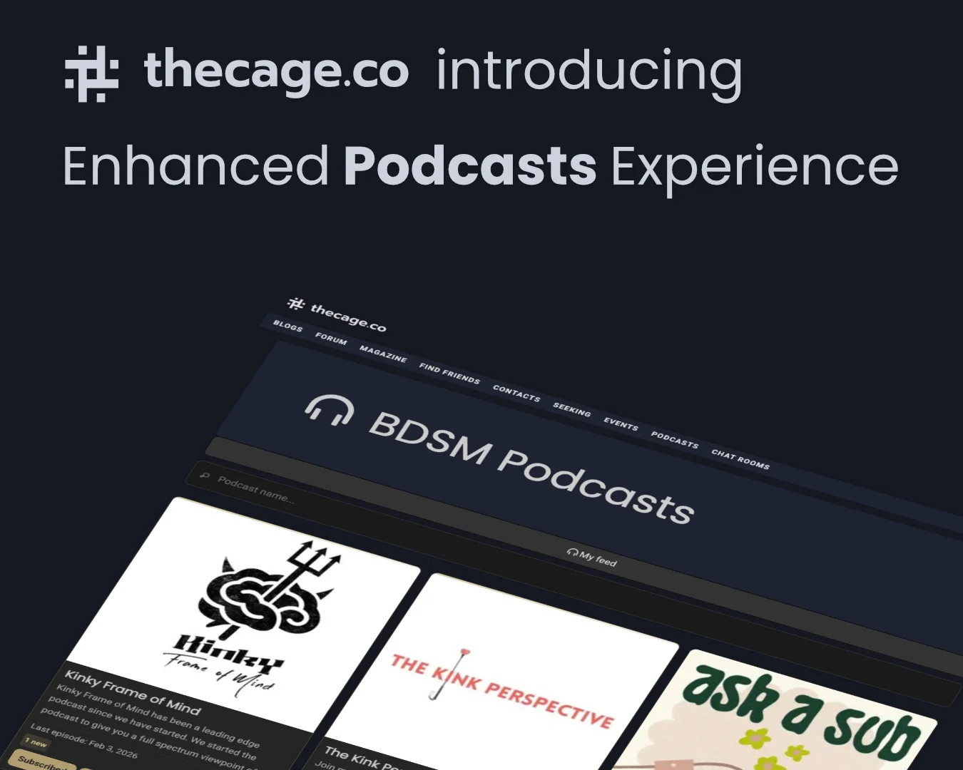 We’re excited to let you know that THE CAGE’s podcast feed has been enhanced and updated to make listening more fun and interactive than ever. You’ll find a wide range of podcasts covering all things kink and BDSM, and now it’s easier than ever to follow, interact with, and enjoy the shows you love.