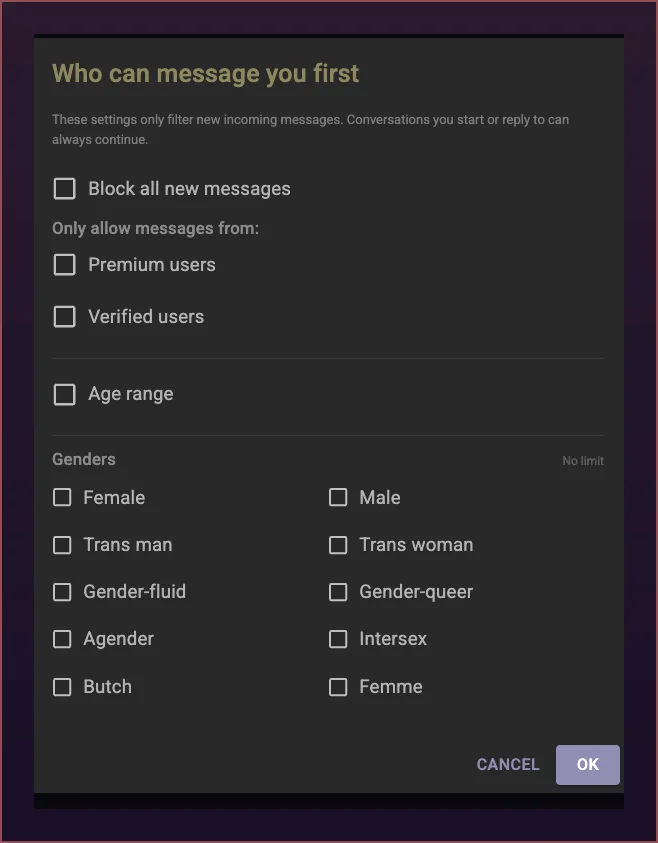 THE CAGE now offers new filters so you can decide who can message you first. You can filter by age range, gender, verification status, and membership level. Please note that these settings only apply to new conversations. Existing conversations will remain available regardless of your updated preferences.