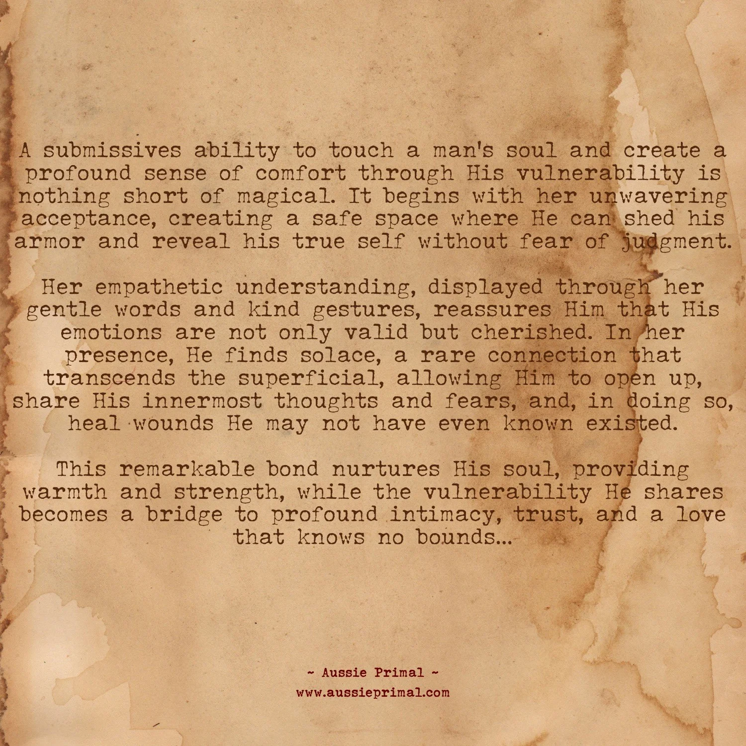 A submissives ability to touch a man's soul and create a profound sense of comfort through His vulnerability is nothing short of magical. It begins with her unwavering acceptance, creating a safe space where He can shed his armour and reveal his true self without fear of judgment.
