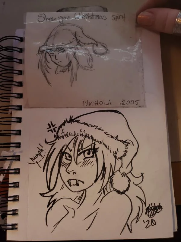 I originally sketched this in 2005 when my grandmother told me to show my Christmas spirit. Being the bratty 16 year old I was, I made that picture above and gave it to her with the shitty comment of "There. There's my Christmas Spirit." I didn't even bother to sign it. Well. My grandmother was looking at some of my recent work and gave me that little slip of paper back! She had placed my name and the year, and put sticky plastic over it (the backing fell off)