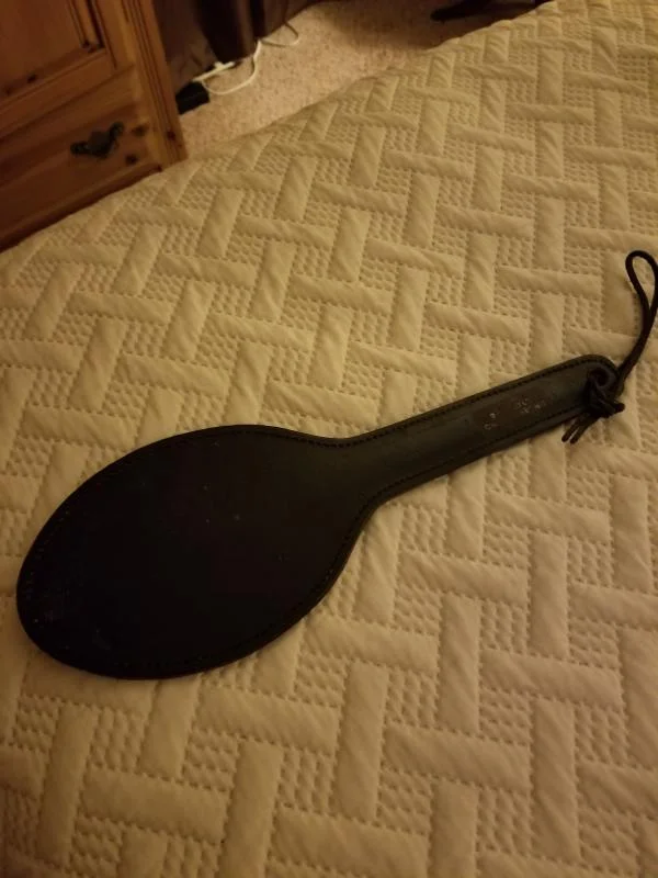 i was chatting with a friend here at The Cage and we were discussing spanking and what our preference to spanking tools are. This is my favourite, it is a stiff leather paddle the has a flat metal rod in the center of the leather to make it stiff and solid. It makes a wonderful smacking sound on contact and gives a nice rosey red color to my pale bottom.