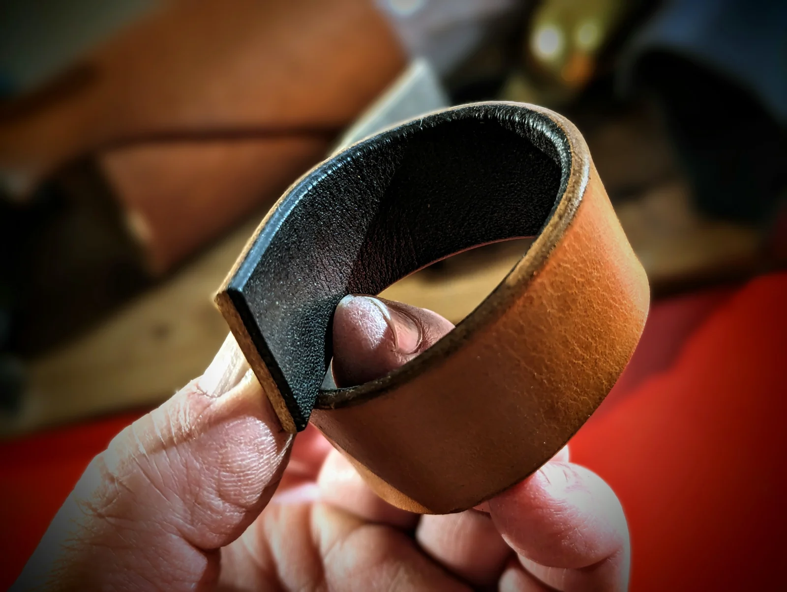 Here I am testing out fancy dyed / burnished edge treatments and also being able to produce shapes w/ variable thickness. Note that the loop of leather has been shaved ("skived") thick on top and very thin around the bottom of the loop, producing this lovely shape to the piece. Quite pleasing and pro-looking.