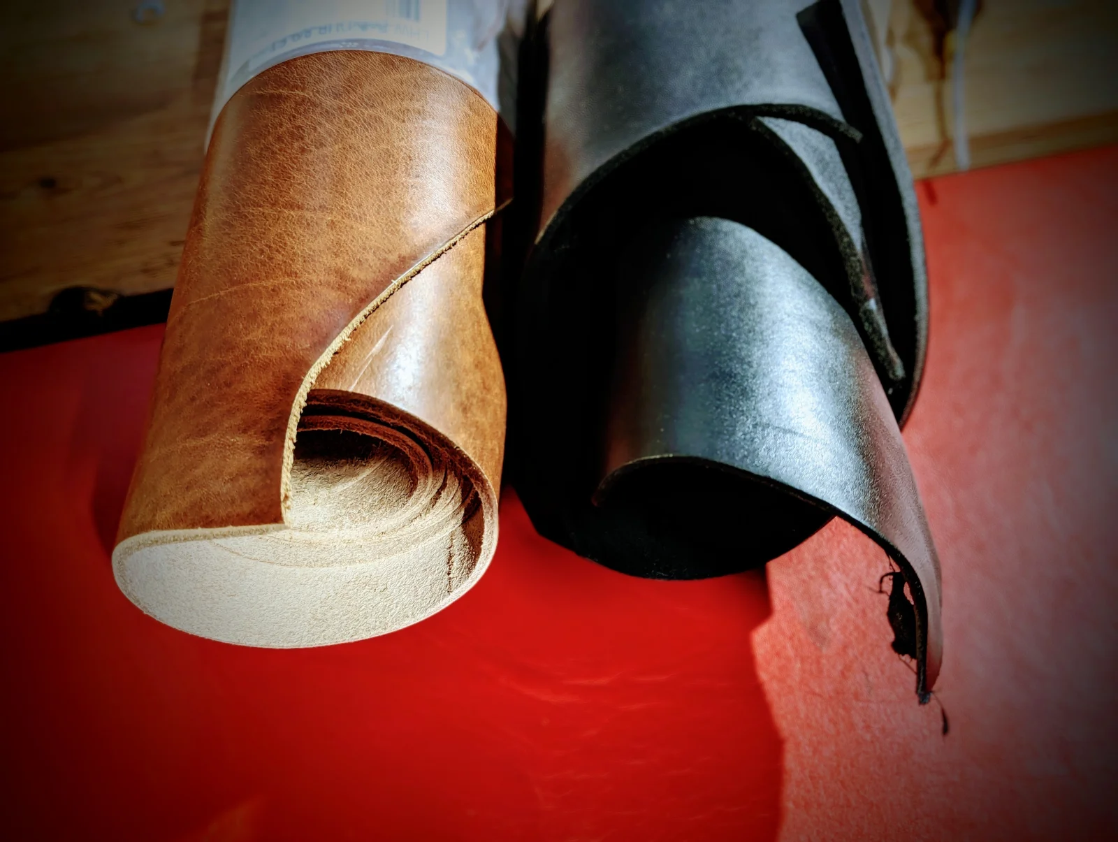 I spent a month sourcing the oldest and finest tanneries in the US & UK and looking at the highest quality English Bridal & Harness Leathers and the heaviest machined, solid brass hardware. I am beyond pleased with this recent shipment, the results of that effort. These leathers are nearly 1/4 inch thick, and the quality is absolutely insane. And thin and delicate others for the linings of collars. Will take more photos soon - the red is just spectacular! The Black & Red is a bit stiff, great for some parts. The English Tan is lovely and softer, and I can also get it in Black--I only like Vegetable Tan Leathers, btw.